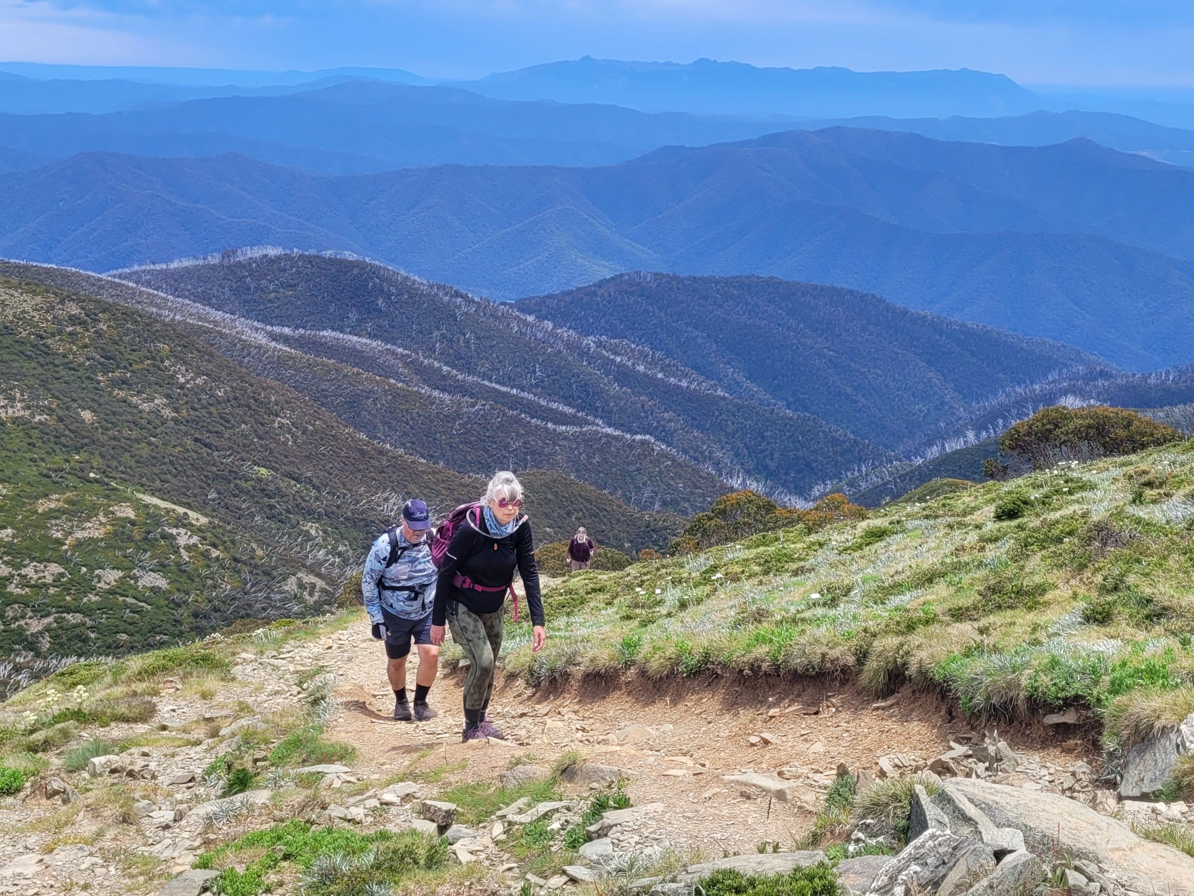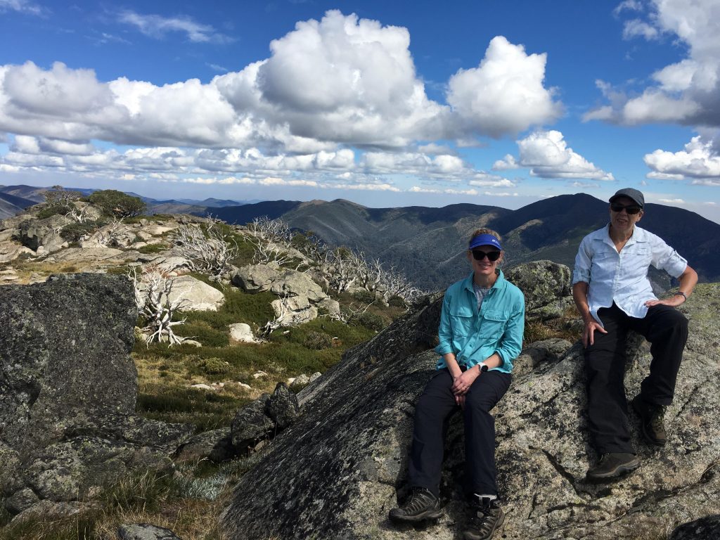 An early start for a big day! We make lunch, pack our gear, leave our accommodation and take a scenic drive through Tawonga Gap to Mountain Creek carpark. Our ascent is via the Staircase Spur track, climbing through the peppermints, then mountain gums, snow gums and finally breaking out above the tree line.